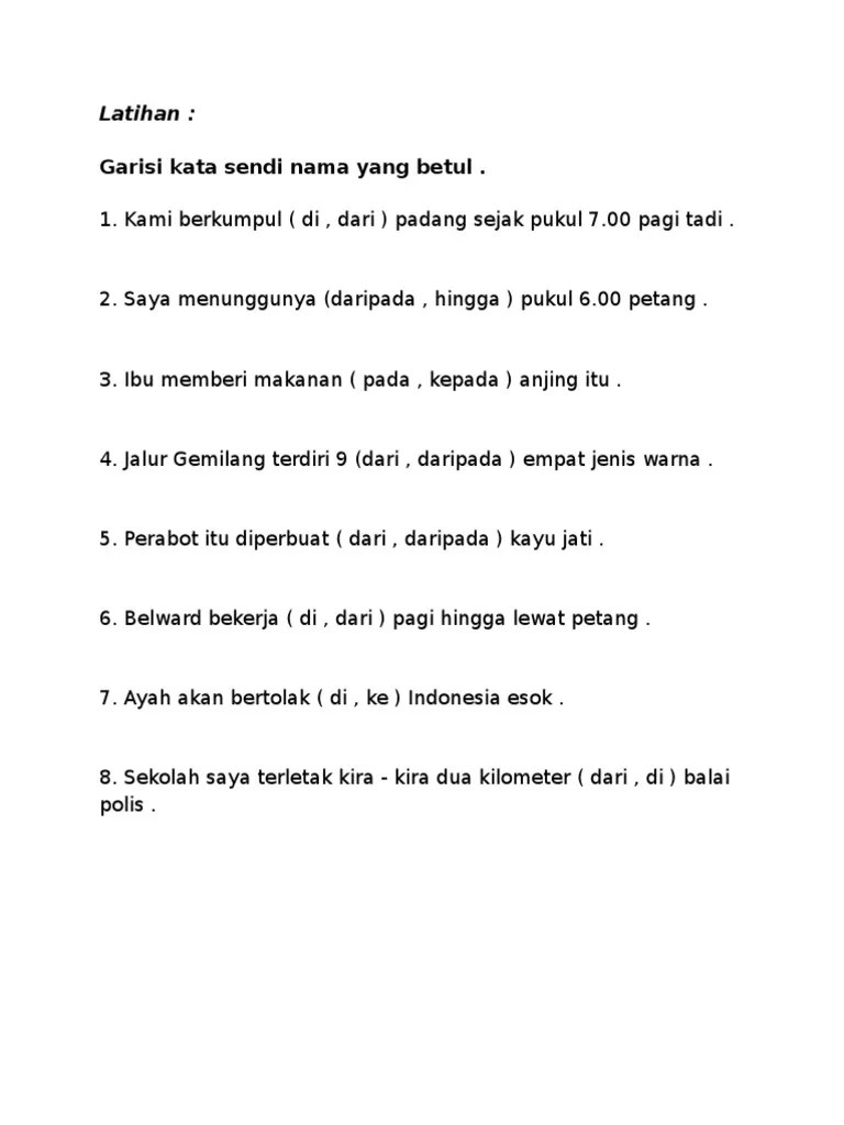 Latihan Kata Sendi Dari Dan Daripada / Set. Mereka pun mungkin tidak banyak bicara, tetapi juga sering meniru ucapan atau gerakan lain. Elakkan penggunaan kata sendi yang diberikan dalam kurungan. (bukan *dan) (c) ali lebih tinggi daripada ahmad. (bukan *dari) (e) buku ini terdiri daripada tiga bahagian. (bukan *daripada) (b) ucapan itu daripada encik jamal. (a) para pelancong dari jepun. (bukan *dari) (d) bekas itu dibuat daripada plastik. Penderitanya mungkin sering beralih dari sangat aktif ke sangat diam dan sebaliknya.
